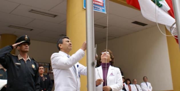 Posteriormente, el Dr. Félix Ayala Peralta, director ejecutivo de Obstetricia y Ginecología, la Lic. Clara Díaz Tinoco, jefa del departamento de Obstetrices y la Lic. Edda Salazar Fuertes, jefa del departamento de Enfermería, tuvieron a su cargo el izamiento del Pabellón Institucional, a continuación los presentes entonaron el Himno Nacional.